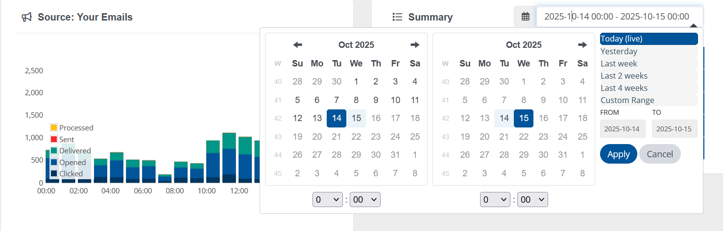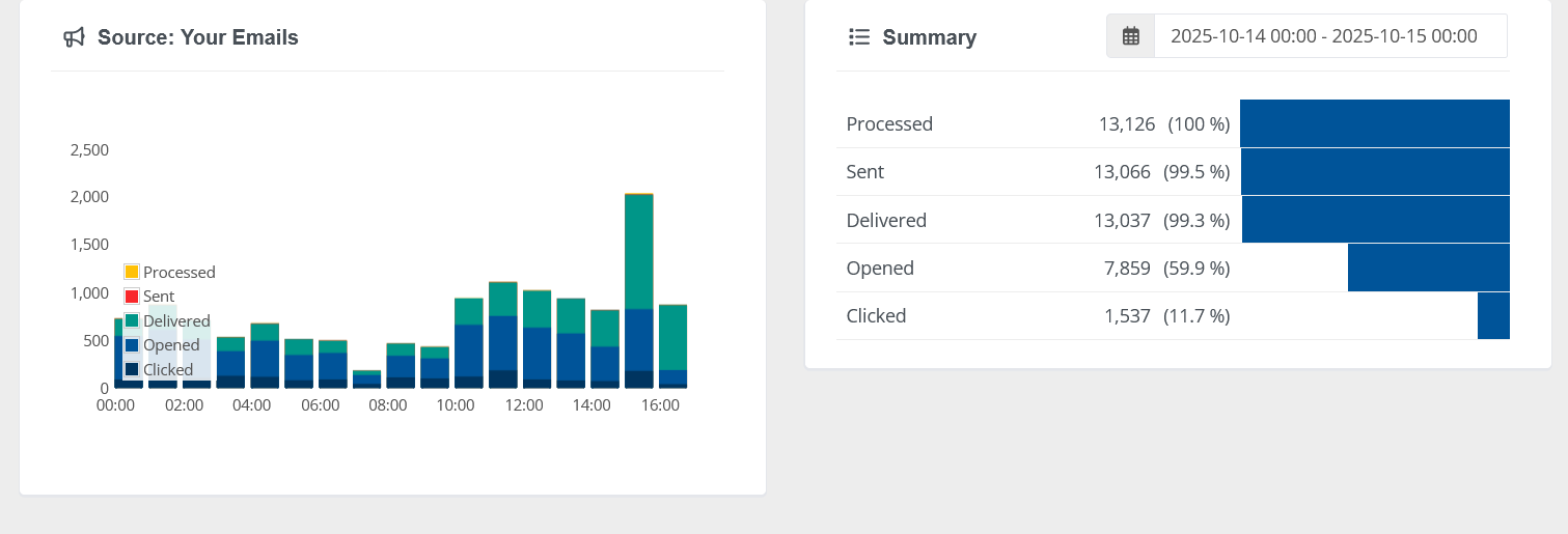 The overview gives you specific information about activity from that source in each period. It shows you the number of messages and their message state. The statistics are a subset of the set above. Delivered is a subset of sent, clicked is a subset of delivered.