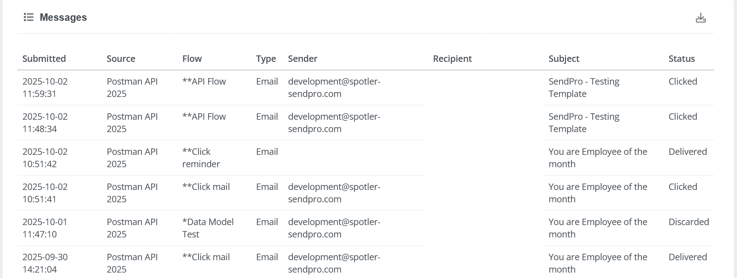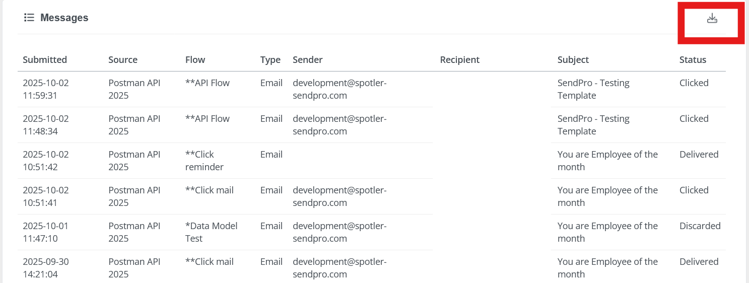 It is possible to export the message details by clicking on the export CSV button on the top right corner of the messages table.