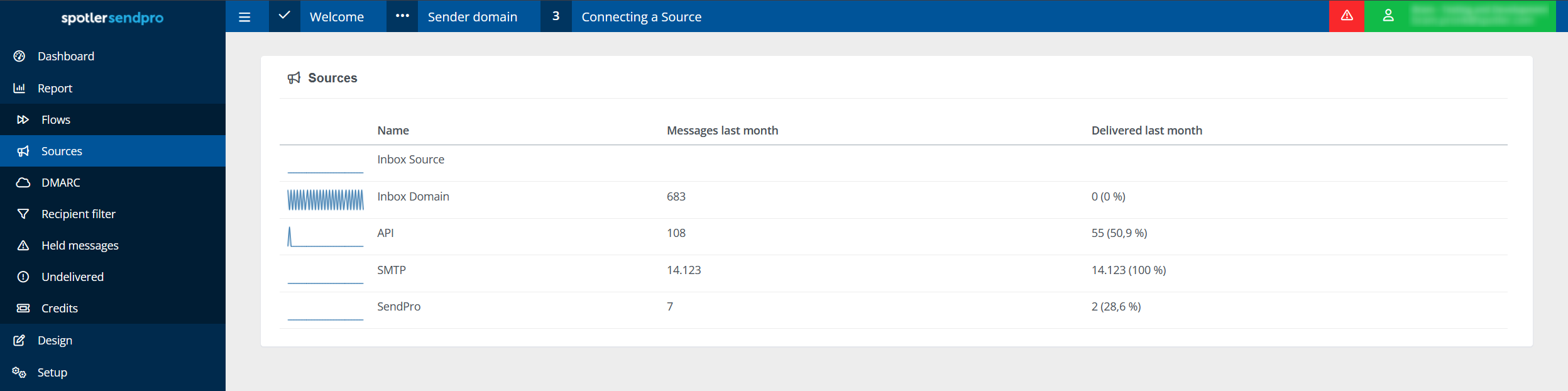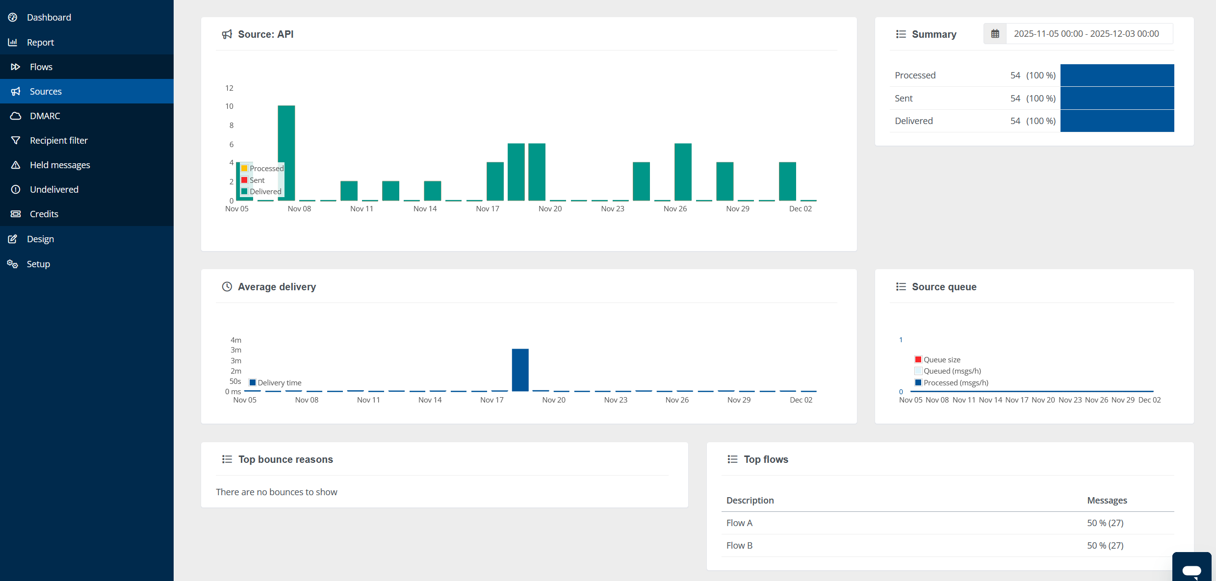 The SendPro platform allows you to create and view reports per source. With a report per source, you can quickly inspect the health of your sources, and gain an insight into the number and type of messages sent.