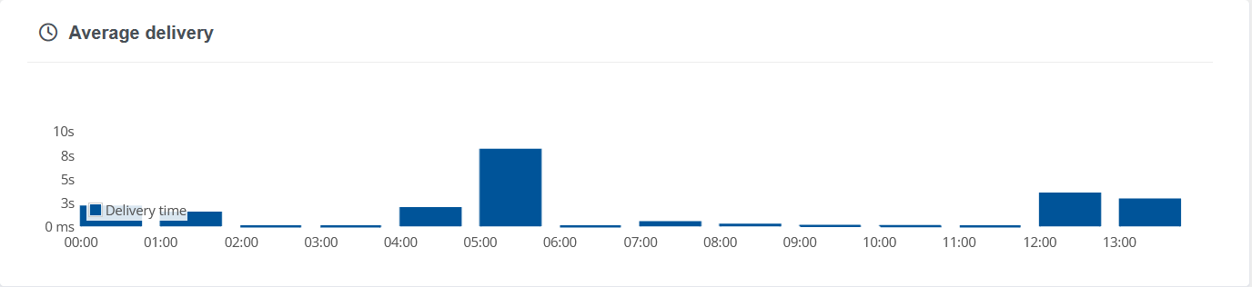 On the source report page, you can see a graphic showing the average delivery time for your emails. These graphic scales based on the calculated average delivery time. While a high delivery time might raise eyebrows, it is important to know that the bulk of emails are delivered within seconds. However, messages that cannot be successfully delivered, due to receiving servers not responding, will impact the average delivery time disproportionately. As these messages take a log time to be successfully delivered.